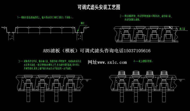 水廠濾池氣水反沖洗濾池常用的濾板有預制濾板和現澆整體濾板兩種:濾頭分為固定式和可調式兩種.固定式適應于預制濾板:可調式長柄濾頭特別適應于現澆濾板.也適應于預制濾板.QSK-ll型可調式長柄濾頭原料采用高強度ABS顆粒樹脂(簡稱ABS工程塑料)經高溫熱溶由精密磨具成型。可調式濾頭主要用:濾帽、濾桿、預埋座組成,濾桿上設有調節螺紋,可供上下調節;且設有調節瓣與預埋座內調節瓣防脫條結合,可控制濾桿調節精度,同時固定其位置。